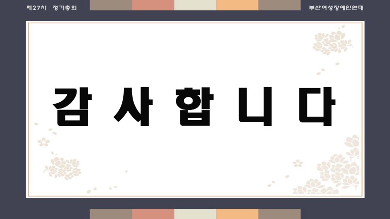 2025년 제27차 정기총회 페이지 정보 작성자 최고관리자 작성일25-02-19 14:47 조회451회 관련링크 다음글 목록 본문 제27차 정기총회(제197차 정기모임)2025년 2월 15일 토요일 오후 2시부산장애인종합회관 2층 대회의실 다음글 목록