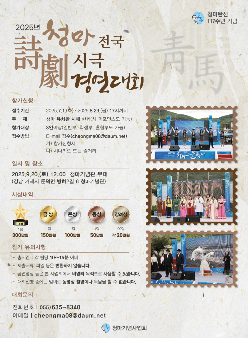 거제 청마시극경연대회 참가(2025.09.20) 페이지 정보 작성자 최고관리자 작성일26-02-11 10:17 조회6회 관련링크 이전글 다음글 목록 본문 *청마시극대회 참가하여 최고의 영예인 대상을 수상하였다. 이전글 다음글 목록