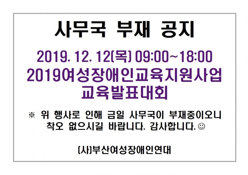 2019 여성장애인교육지원사업 '교육발표대회'로 인한 사무국 부재 공지 (12월 12일)