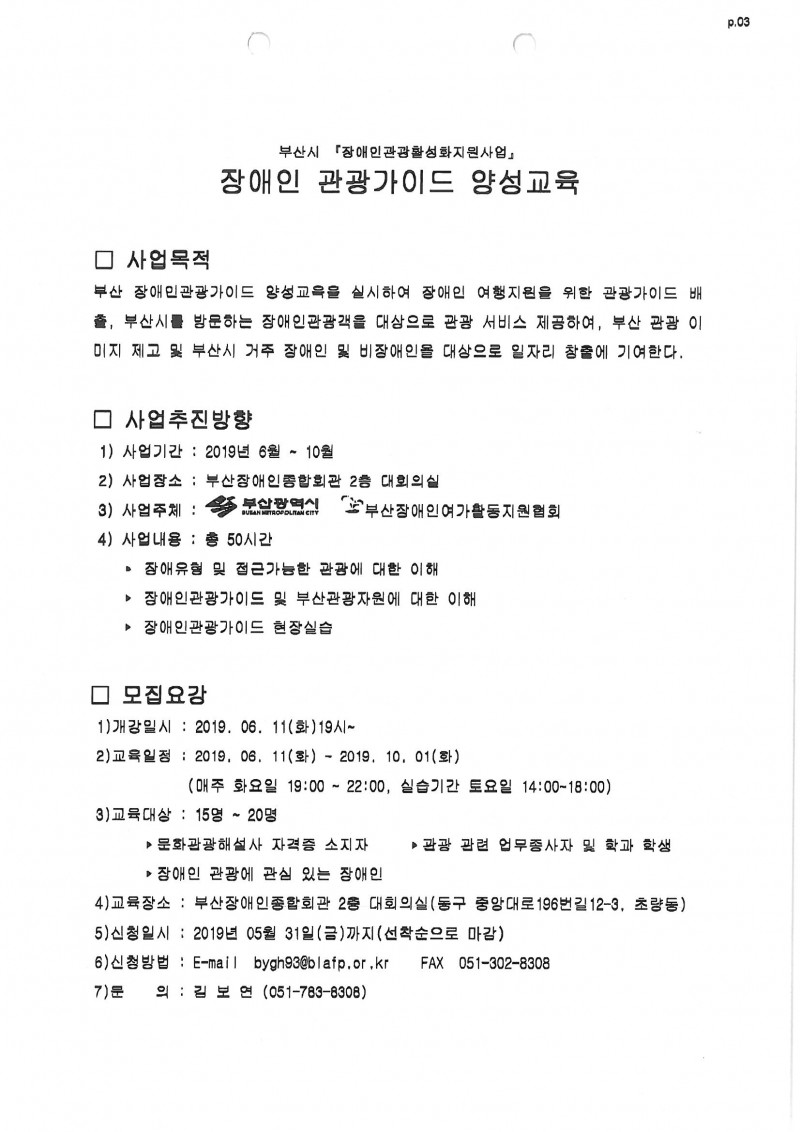 장애인관광가이드 양성교육 교육생모집 페이지 정보 작성자 최고관리자 작성일19-05-27 14:51 관련링크 목록 본문 장애인관광가이드 양성교육 교육생 모집에 대한 안내입니다. 문의사항이 있으시면 김보연 051-73-8308 로 연락하시면 됩니다. 목록