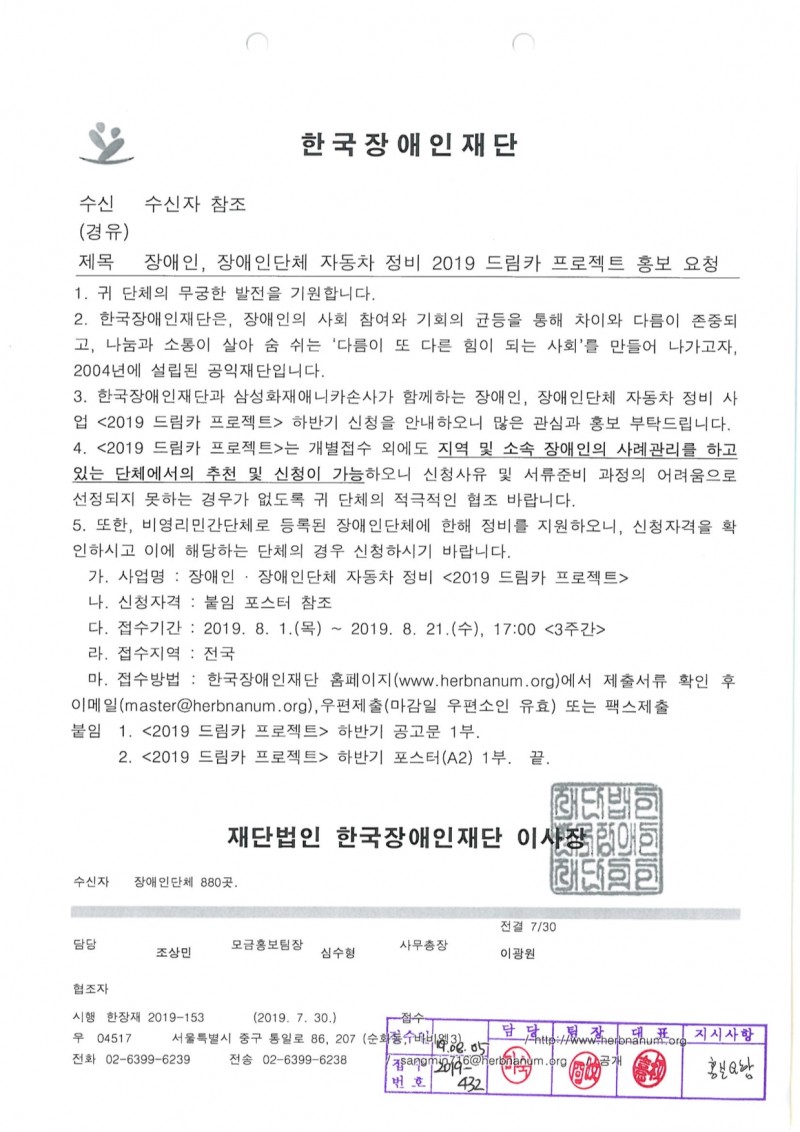 한국장애인재단 자동차 정비 사업 <2019 드림카 프로젝트> 지원 희망자 모집 페이지 정보 작성자 최고관리자 작성일19-08-07 17:38 관련링크 목록 본문 한국장애인재단 자동차 정비 사업 <2019 드림카 프로젝트>내용 확인하시고 지원을 희망하시는 분이나 주변에 지원을 필요로 하시는 분이 계시면 연락 부탁드립니다.문의 : 김지현 대리 (070-4355-2310)유혜인 활동가 (070-4355-0907) 목록
