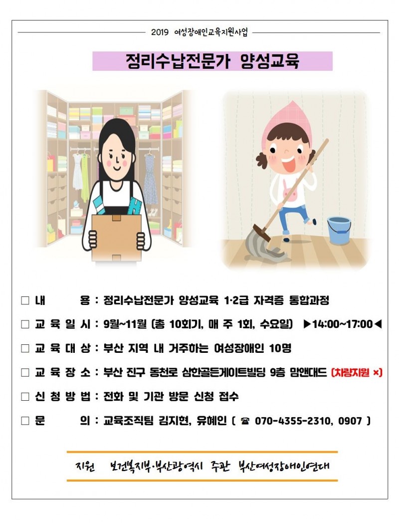2019여성장애인교육지원사업 "정리수납전문가 양성교육" 참가자 모집 페이지 정보 작성자 최고관리자 작성일19-08-14 14:15 관련링크 목록 본문 ※ 정리수납전문가양성교육 수업은 1·2급 자격증 통합과정으로 이론수업이 끝난 뒤에는 실습수업이 동반되며 실습지는 개인 가정집으로 휠체어 진입이 어려울 수 있습니다. 또한 취업 연계 후에도 휠체어 이용 대상자는 위에 사유와 같이 현장 방문의 제한이 있는 점을 고려하여 교육대상에서 부득이하게 제외될 수밖에 없는 점 양해 부탁드립니다. 목록