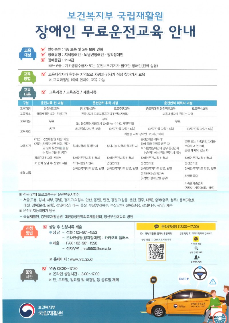 장애인 무료운전교육 안내 페이지 정보 작성자 최고관리자 작성일18-11-09 13:41 관련링크 목록 본문 보건복지부 국립재활원 장애인 무료운전교육 안내교육대상자가 원하는 지역으로 차량과 강사가 직접 찾아가서 교육 예정 <신청방법-상담 후 신청서류 제출>* 상담 - 전화 : 02-901-1553 - 온라인상담(청각장애인) : 카카오톡 플러스 * 제출 - FAX : 02-901-1550 - 전자우편 : nrc1550@korea.kr 목록