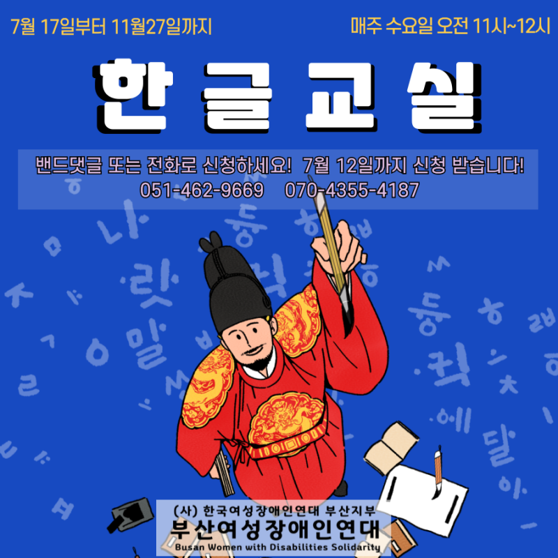 [마감] "한 글 교 실" 참가자 모집 페이지 정보 작성자 최고관리자 작성일24-07-02 11:51 관련링크 목록 본문 [한글교실 참가자 모집]일 시 7월 17일(수)-11월 27일(수) 매주 11-12시(총 14회기)장 소 부산여성장애인연대 본회의실(4층)대 상 여성장애인 5명내 용 한글문해교육신청기간 7월 12일(금) 오후 6시까지신청방법 밴드 또는 전화 신청문 의 051-462-9669, 070-4355-4187 목록