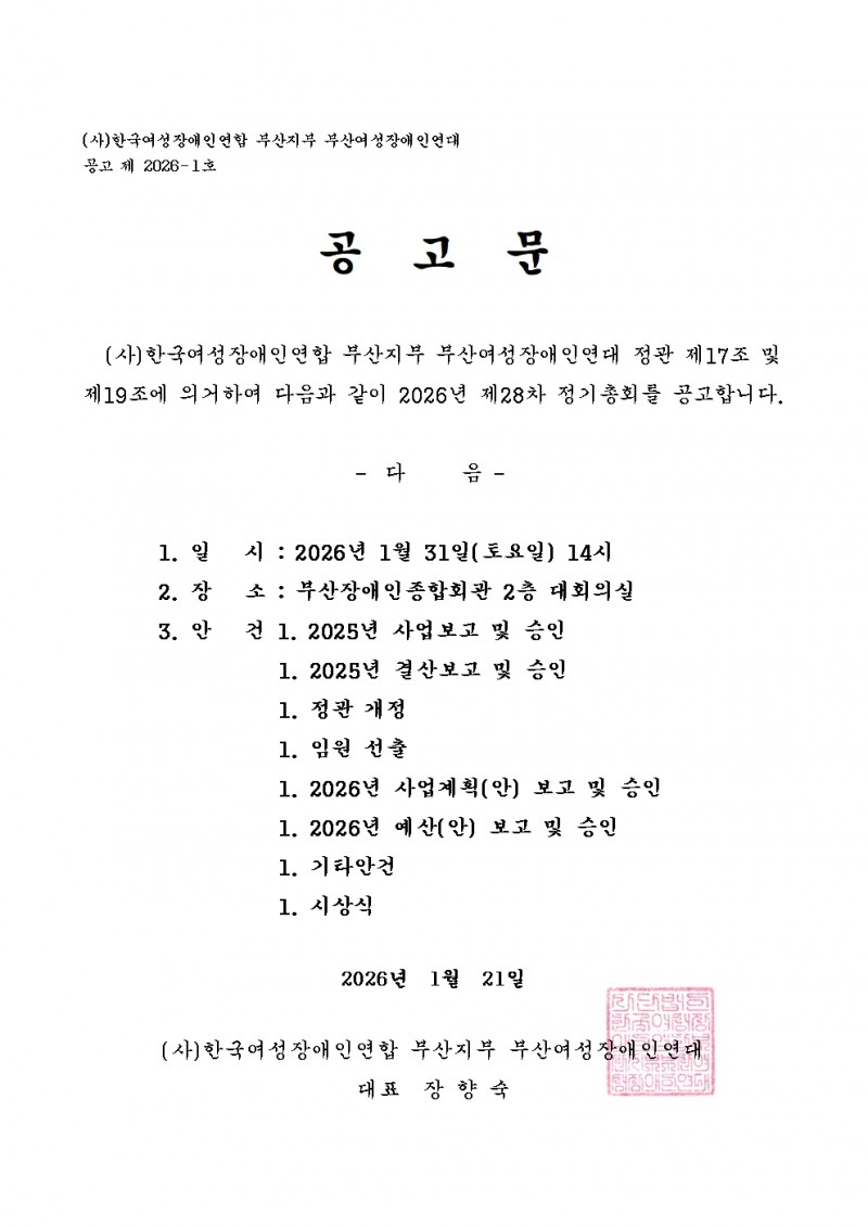 부산여성장애인연대에서는 2026년 제28차 정기총회를 다음과 같이 개최합니다.