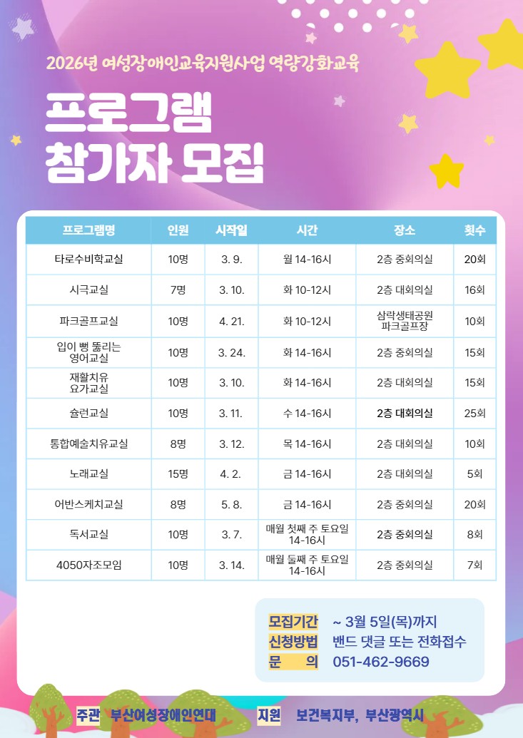 2026년 여성장애인교육지원사업 프로그램 참가자를 모집합니다.