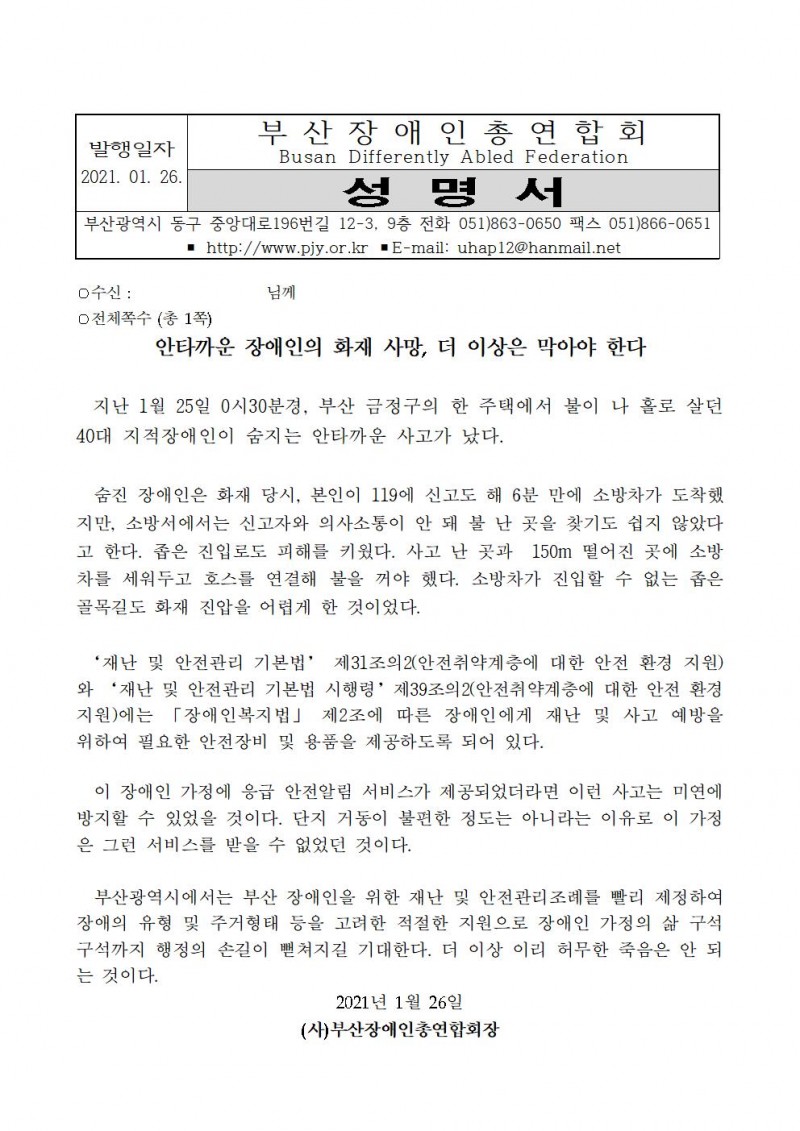 (성명서-부산장총) 안타까운 장애인의 화재 사망, 더 이상은 막아야 한다.