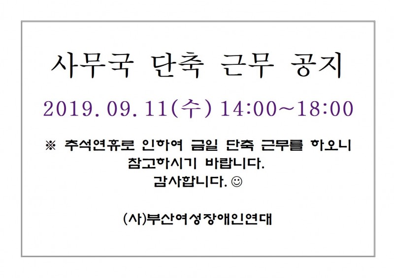 사무국 단축 근무 공지-2019년 9월 11일(수)