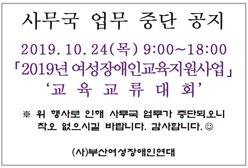 2019여성장애인교육지원사업'교육교류대회'행사로 인한 사무국 업무중단 (10월 24일)