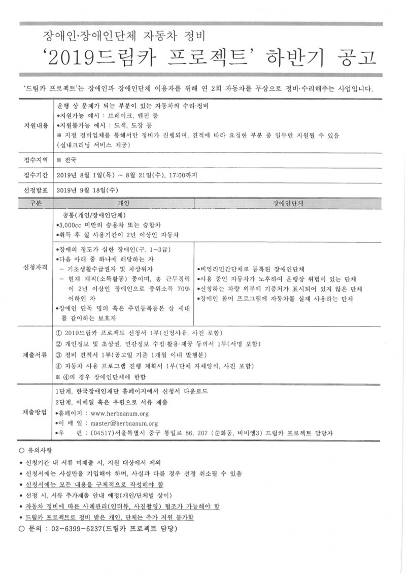 한국장애인재단 자동차 정비 사업 <2019 드림카 프로젝트> 지원 희망자 모집 페이지 정보 작성자 최고관리자 작성일19-08-07 17:38 관련링크 목록 본문 한국장애인재단 자동차 정비 사업 <2019 드림카 프로젝트>내용 확인하시고 지원을 희망하시는 분이나 주변에 지원을 필요로 하시는 분이 계시면 연락 부탁드립니다.문의 : 김지현 대리 (070-4355-2310)유혜인 활동가 (070-4355-0907) 목록