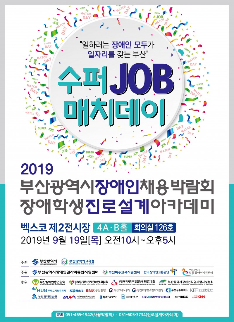2019년 수퍼JOB매치데이(부산장애인채용박람회) 페이지 정보 작성자 최고관리자 작성일19-09-09 16:25 관련링크 목록 본문 부산광역시장애인채용박람회, 장애학생진로설계아카데미 "수퍼 JOB 매치데이" - 일 시 : 2019년 9월 19일(목) 10:00 ~ 17:00- 장 소 : 벡스코 제2전시장 4A,B홀- 준비물 : 복지카드 및 이력서- 문 의 : 051-517-9667 / 직업재활팀 목록