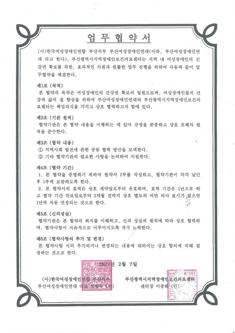 부산광역시지역장애인보건의료센터와 MOU체결(2022.2.7) 페이지 정보 작성자 최고관리자 작성일22-02-08 14:11 관련링크 목록 본문 부산여성장애인연대와 부산광역시지역장애인보건의료센터가 '여성장애인 건강보건관리를 위한 업무협약(MOU)을 진행하였습니다.앞으로도 여성장애인 건강보건 관리를 위하여 함께 노력하겠습니다! 목록